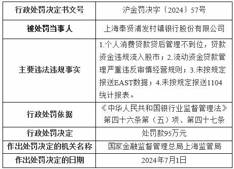 国家金融监督管理总局上海监管局依据《中华人民共和国银行业监督管理法》第四十六条第(五)项、第四十七条,对上海奉贤浦发村镇银行股份有限公司处罚款95万元。
