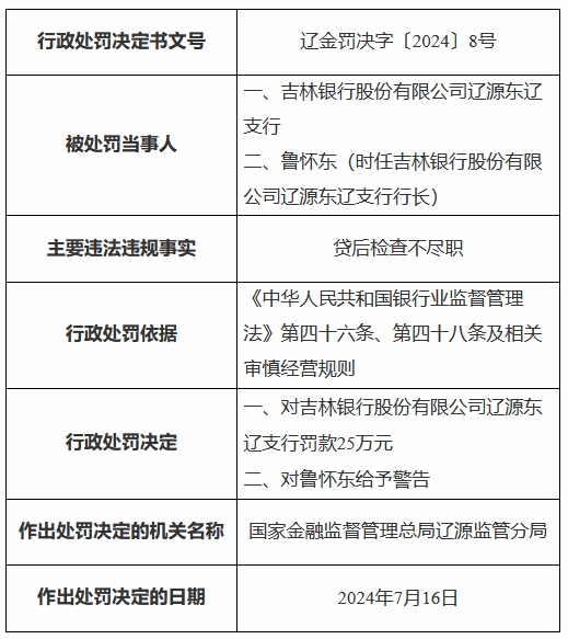 吉林银行辽源东辽支行违规被罚 贷后检查不尽职