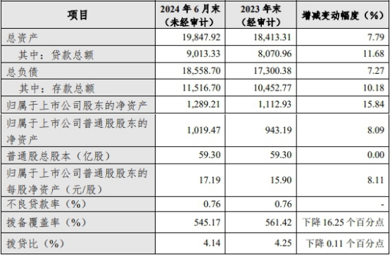 截至2024年6月末,公司总资产19,847.92亿元,较上年末增长7.79%;贷款总额9,013.33亿元,较上年末增长11.68%;总负债18,558.70亿元,较上年末增长7.27%;存款总额11,516.70亿元,较上年末增长10.18%。