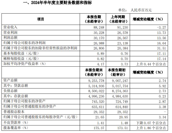 截至报告期末,浦发银行资产总额92,537.78亿元,较上年末增加2,465.31亿元,增长2.74%;其中,贷款总额53,149.36亿元,较上年末增加2,971.82亿元,增长5.92%。报告期末负债总额85,000.22亿元,较上年末增加2,256.59亿元,增长2.73%;其中,存款总额49,962.36亿元,较上年末增加116.06亿元,增长0.23%。