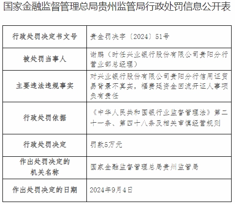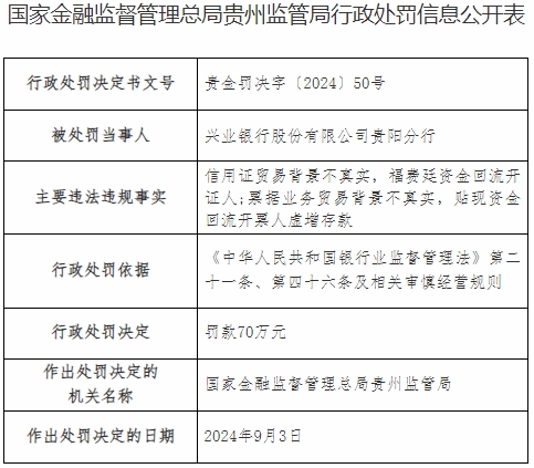 兴业银行贵阳分行被罚70万元 信用证贸易背景不真实等