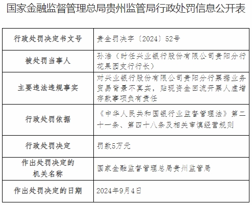 中国经济网北京9月13日讯 国家金融监督管理总局网站昨日公布的贵州监管局行政处罚信息公开表(贵金罚决字〔2024〕50号-52号)显示,兴业银行股份有限公司贵阳分行信用证贸易背景不真实,福费廷资金回流开证人;票据业务贸易背景不真实,贴现资金回流开票人虚增存款。