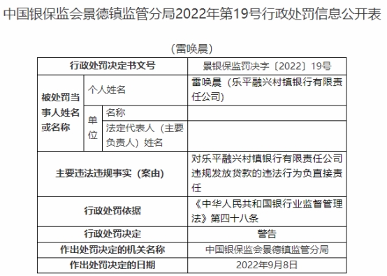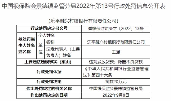 中国经济网北京10月14日讯 国家金融监督管理总局网站10月12日发布的行政处罚决定书(景银保监罚决字〔2022〕13号-19号)显示,乐平融兴村镇银行有限责任公司存在以下违法违规事实:违规发放贷款;隐匿不良贷款。
