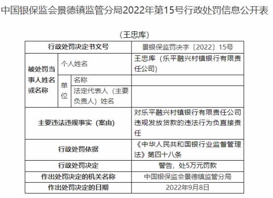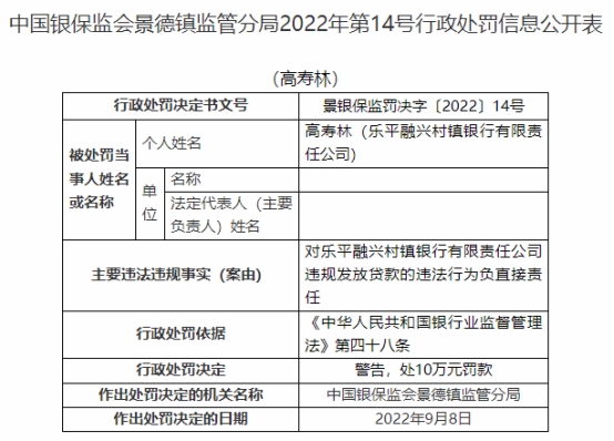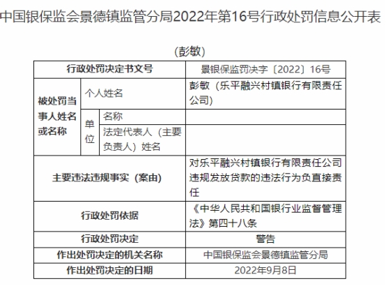同时,高寿林(乐平融兴村镇银行有限责任公司)、王忠库(乐平融兴村镇银行有限责任公司)、彭敏(乐平融兴村镇银行有限责任公司)、于汇洋(乐平融兴村镇银行有限责任公司)、徐健雄(乐平融兴村镇银行有限责任公司)、雷唤晨(乐平融兴村镇银行有限责任公司)对该行违规发放贷款的违法行为负直接责任。