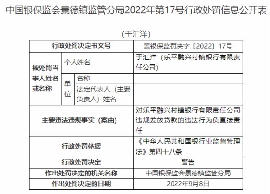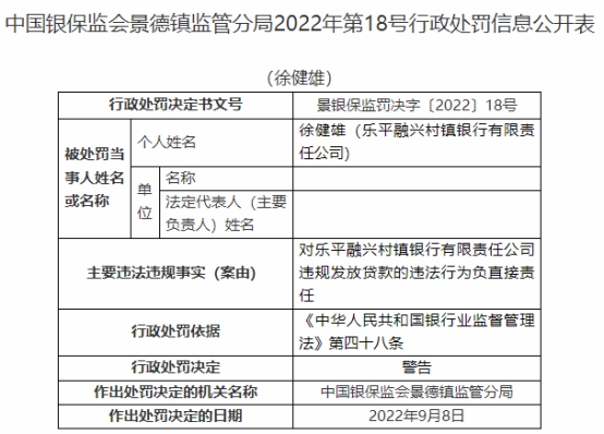 依据《中华人民共和国银行业监督管理法》第四十六条,中国银保监会景德镇监管分局对乐平融兴村镇银行有限责任公司罚款20万元。