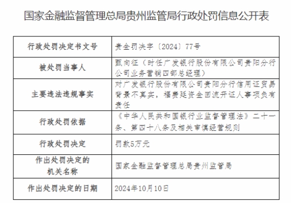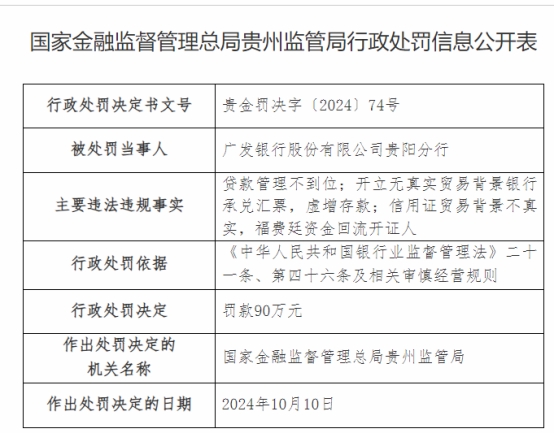 中国经济网北京10月14日讯 国家金融监督管理总局网站10月12日公布的行政处罚决定书(贵金罚决字〔2024〕74-77号)显示,广发银行股份有限公司贵阳分行存在以下主要违法违规事实:贷款管理不到位;开立无真实贸易背景银行承兑汇票,虚增存款;信用证贸易背景不真实,福费廷资金回流开证人。