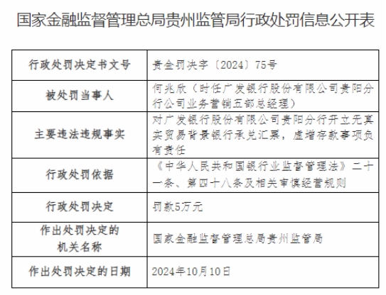 何兆欣(时任广发银行股份有限公司贵阳分行公司业务营销五部总经理)对该分行开立无真实贸易背景银行承兑汇票,虚增存款事项负有责任;龚志刚(时任广发银行股份有限公司贵阳分行营业部副总经理(主持工作))对该分行贷款管理不到位事项负有责任;甄向征(时任广发银行股份有限公司贵阳分行公司业务营销四部总经理)对该分行信用证贸易背景不真实,福费廷资金回流开证人事项负有责任。