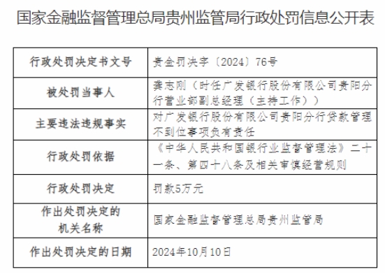 广发银行贵阳分行违规被罚90万 贷款管理不到位