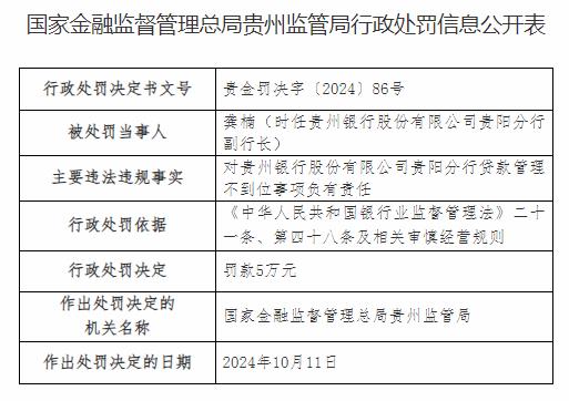 国家金融监督管理总局贵州监管局行政处罚信息公开表(贵金罚决字〔2024〕86号)显示,龚楠(时任贵州银行股份有限公司贵阳分行副行长)对贵州银行股份有限公司贵阳分行贷款管理不到位事项负有责任,根据《中华人民共和国银行业监督管理法》二十一条、第四十八条及相关审慎经营规则的规定,国家金融监督管理总局贵州监管局决定对其处以罚款5万元。