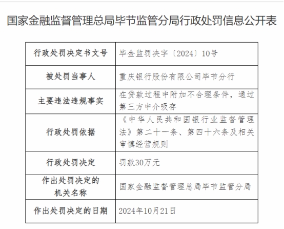 重庆银行毕节分行违规被罚 贷款过程中附加不合理条件
