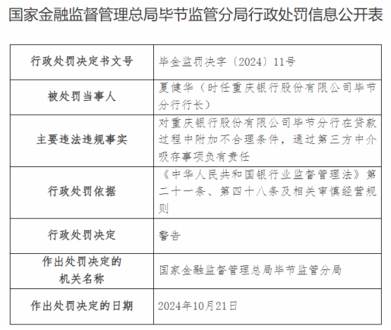 国家金融监督管理总局毕节监管分局依据《中华人民共和国银行业监督管理法》第二十一条、第四十六条及相关审慎经营规则,对重庆银行股份有限公司毕节分行罚款30万元;依据《中华人民共和国银行业监督管理法》第二十一条、第四十八条及相关审慎经营规则,对夏健华处以警告。