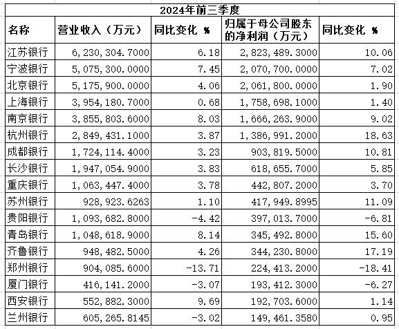 中国经济网北京11月5日讯 A股17家上市城商行2024年三季报已披露完毕。今年前三季度,江苏银行实现营收623.03亿元,净利润282.35亿元,继续稳居第一。营收排名第二、第三的分别为北京银行517.59亿元、宁波银行507.53亿元。