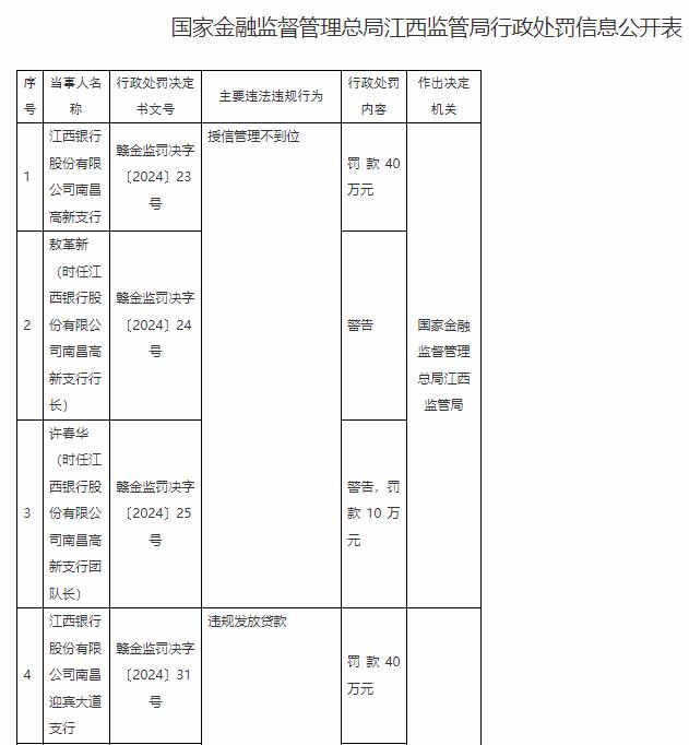 国家金融监督管理总局江西监管局对江西银行股份有限公司南昌高新支行处以罚款40万元,对敖革新处以警告,对许春华处以警告并罚款10万元。