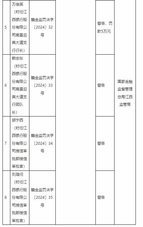 国家金融监督管理总局江西监管局对江西银行股份有限公司南昌迎宾大道支行处以罚款40万元,对万俊英、赖志东、胡宁西、刘琅问处以警告。