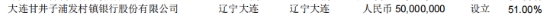 浦发银行(600000.SZ)年报显示,浦发银行对子公司大连甘井子浦发村镇银行股份有限公司持股51%。