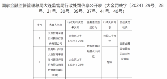 中国经济网北京12月3日讯 国家金融监督管理总局2日公布的国家金融监督管理总局大连监管局行政处罚信息公开表(大金罚决字〔2024〕28、29号)显示,大连甘井子浦发村镇银行股份有限公司存在数据质量问题整改不到位的违法违规行为。国家金融监督管理总局大连监管局对该行处以罚款二十万元;对田美玲(时任大连甘井子浦发村镇银行股份有限公司综合管理部副总经理)处以警告。
