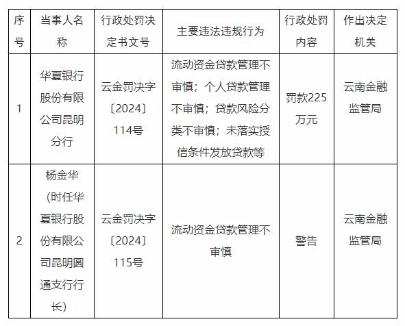根据国家金融监督管理总局网站近日发布的行政处罚信息公开表(云金罚决字〔2024〕114号、115号)显示,因流动资金贷款管理不审慎;个人贷款管理不审慎;贷款风险分类不审慎;未落实授信条件发放贷款等,国家金融监督管理总局云南金融监管局对华夏银行股份有限公司昆明分行罚款225万元;杨金华(时任华夏银行股份有限公司昆明圆通支行行长)警告。