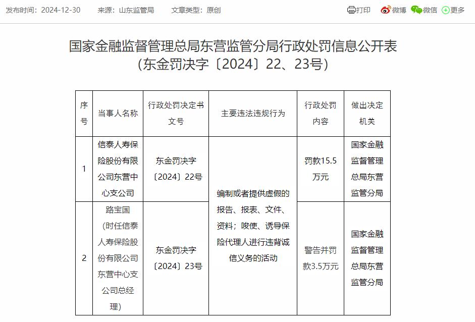 中国经济网北京1月5日讯 国家金融监督管理总局东营监管分局近日公布的行政处罚信息公开表(东金罚决字〔2024〕22、23号)显示,信泰人寿保险股份有限公司东营中心支公司编制或者提供虚假的报告、报表、文件、资料;唆使、诱导保险代理人进行违背诚信义务的活动,被罚款15.5万元。