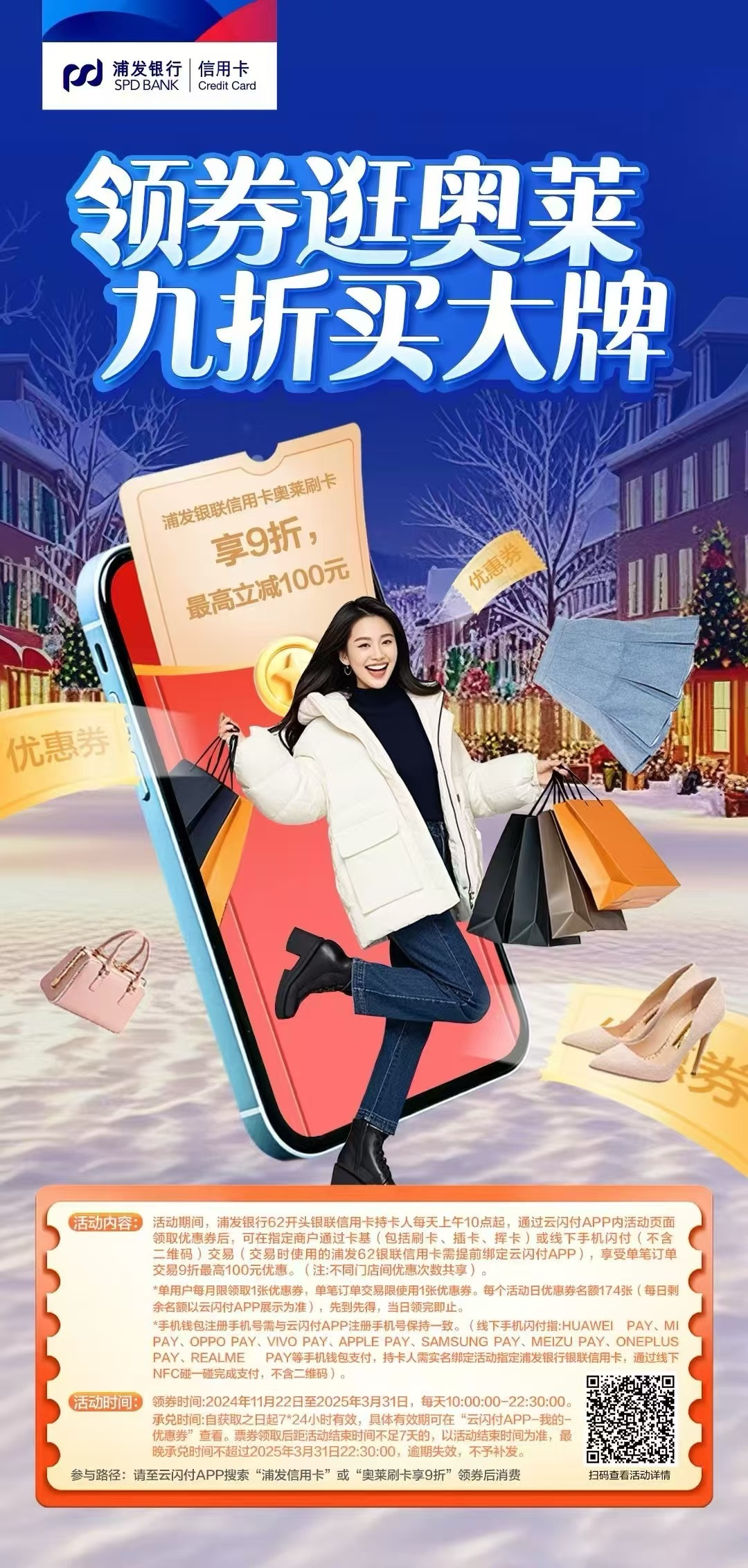 伴随新年的脚步临近,众多消费者开始为自己、家人和朋友购买挑选新年礼物,收获满满的仪式感,传递温暖心意和祝福。奥特莱斯通过提供品牌优惠商品和多元的购物环境,成为备受消费者青睐的购物目的地。紧扣岁末年初消费窗口,紧跟消费趋势、市场环境以及消费观念的变化,浦发信用卡携手银联推出奥特莱斯优惠活动,为用户提供优质、优惠的购物体验,释放消费活力。