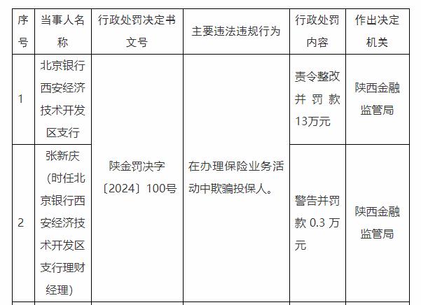 北京银行西安经济技术开发区支行被罚13万元:在办理保险业务活动中欺骗投保人