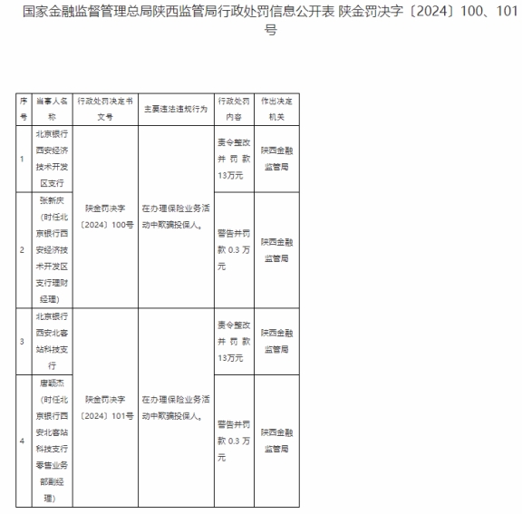 陕西金融监管局对北京银行西安经济技术开发区支行、北京银行西安北客站科技支行责令整改并各罚款13万元;对张新庆、唐颖杰警告并各罚款0.3万元。