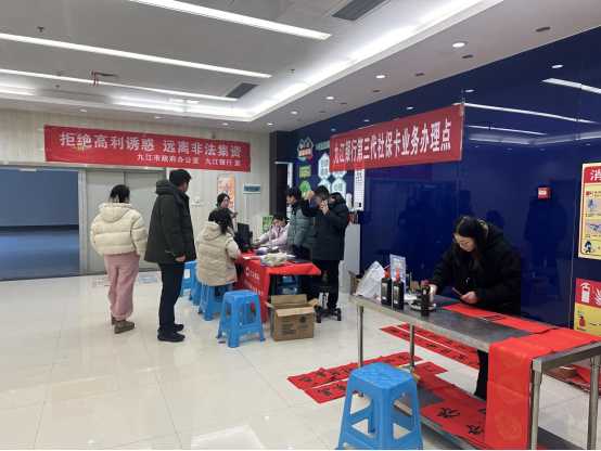 九江银行以网点为阵地,通过现场宣传、上门服务等方式开展第三代社保卡推广和防范非法集资宣传。同时,将柜台外迁,实现社保卡移动发卡功能,当日社保卡申领114张,服务市民超千人次。活动现场,九江银行还邀请到了书法协会成员,现场挥毫泼墨为市民书写寓意吉祥的春联。一幅幅春联传递了新春的祝福,融入了市民对美好生活的向往。