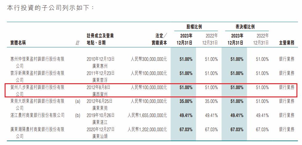 东莞农商银行(09889.HK)年报显示,贺州八步东盈村镇银行股份有限公司,于2012年8月8日在中国注册成立的股份有限公司,为东莞农商银行的非全资子公司。东莞农商银行持股比例为51%。