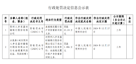 中国经济网北京1月13日讯 中国人民银行贺州市分行行政处罚决定信息公示表(贺银罚决字[2024]1号)显示,贺州八步东盈村镇银行股份有限公司存在以下违法行为:未按规定履行客户身份重新识别义务,中国人民银行贺州市分行决定对其处以罚款23.24万元。