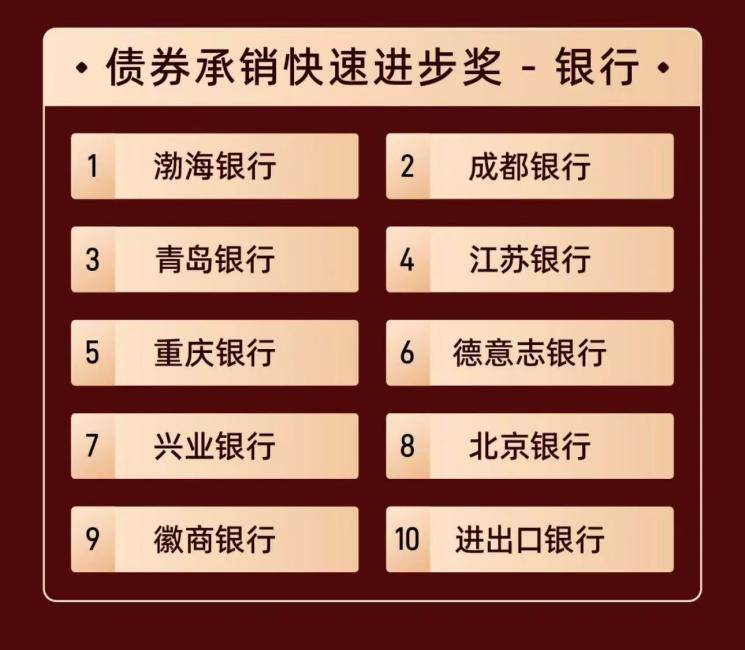 渤海银行本次奖项的获得,既体现了市场主流机构对该行债券承销能力的肯定,也是对其深耕实体经济融资、持续创新竞进的认可。展望未来,渤海银行将始终围绕党中央关于金融工作的各项决策部署,牢牢把握金融工作的政治性、人民性,踏实奋进,创新作为,为做好金融“五篇大文章”、服务经济高质量发展贡献“渤海力量”! 金融界资讯
