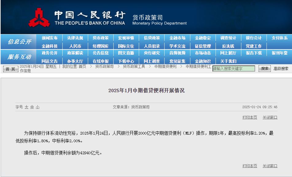 中国人民银行1月24日开展2000亿元中期借贷便利(MLF)操作,中标利率2.00%,较上月持平。