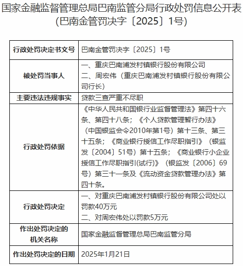 国家金融监督管理总局巴南监管分局依据《中华人民共和国银行业监督管理法》第四十六条、第四十八条;《个人贷款管理暂行办法》(中国银监会令2010年第1号)第十三条、第三十五条;《商业银行授信工作尽职指引》(银监发〔2004〕51号)第十五条;《商业银行小企业授信工作尽职指引(试行)》(银监发〔2006〕69号)第三十一条及《流动资金贷款管理办法》第四十条,对重庆巴南浦发村镇银行股份有限公司处以罚款40万元;对周宏伟处以罚款5万元。