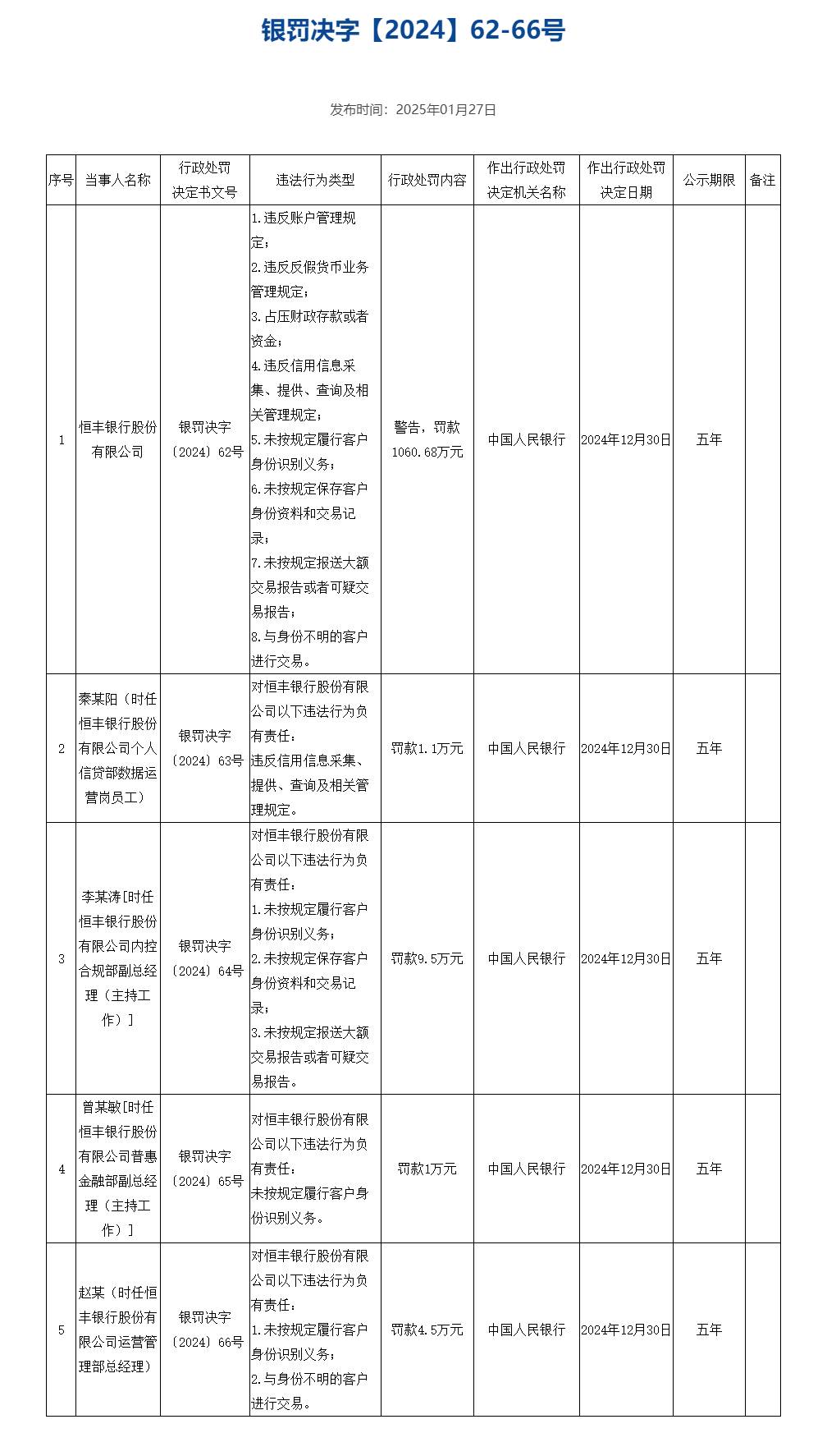 恒丰银行8宗违规被罚1060万元 违反账户管理规定等