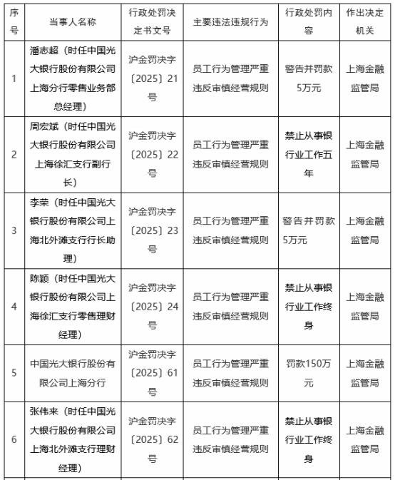 中国经济网北京2月10日讯 国家金融监督管理总局网站近日公布的上海监管局行政处罚信息公开表(沪金罚决字〔2025〕21-24号,61-62号)显示,中国光大银行股份有限公司上海分行员工行为管理严重违反审慎经营规则。上海金融监管局对该分行罚款150万元。