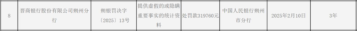 【大河财立方消息】2月12日消息,中国人民银行朔州市分行近日披露多则行政处罚决定信息,其中,晋商银行朔州分行因存在提供虚假的或隐瞒重要事实的统计资料的违法行为,被处罚款约31.98万元。