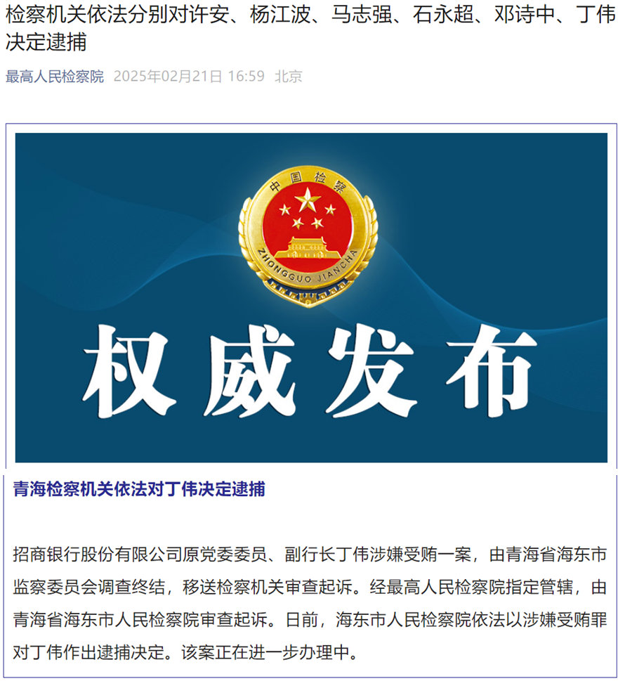 中国经济网北京2月21日讯 最高人民检察院微信公众号今日披露,招商银行股份有限公司原党委委员、副行长丁伟涉嫌受贿一案,由青海省海东市监察委员会调查终结,移送检察机关审查起诉。经最高人民检察院指定管辖,由青海省海东市人民检察院审查起诉。日前,海东市人民检察院依法以涉嫌受贿罪对丁伟作出逮捕决定。该案正在进一步办理中。