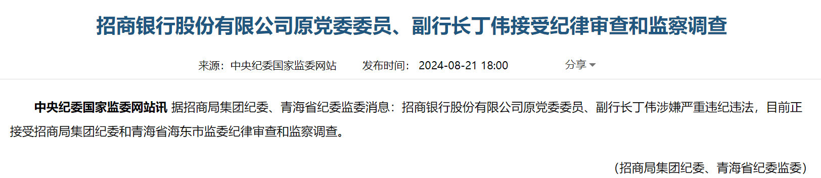 2024年8月,中央纪委国家监委网站通报:据招商局集团纪委、青海省纪委监委消息:招商银行股份有限公司原党委委员、副行长丁伟涉嫌严重违纪违法,目前正接受招商局集团纪委和青海省海东市监委纪律审查和监察调查。