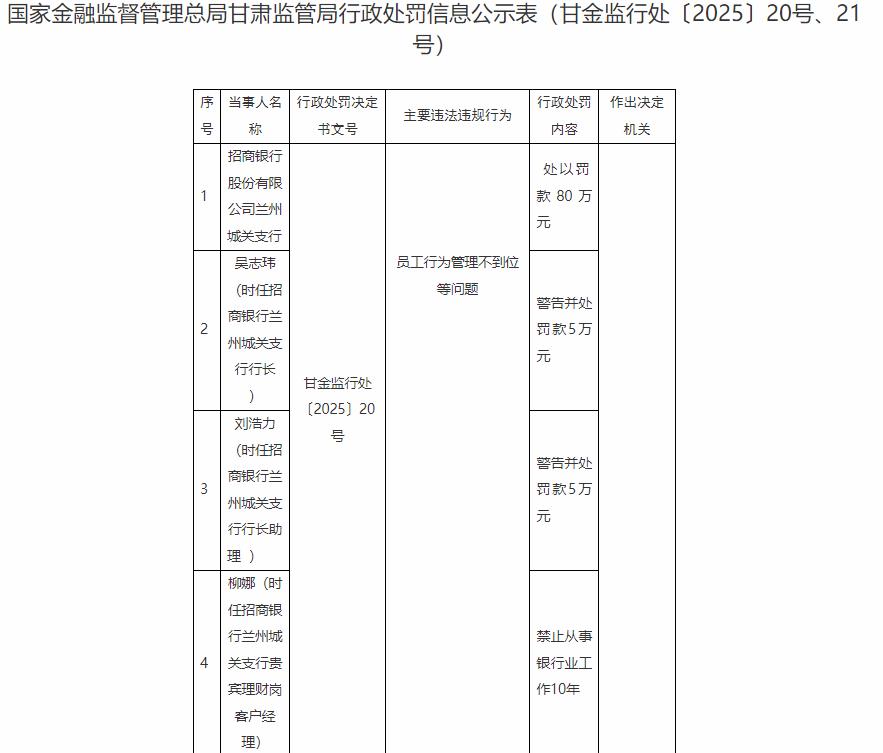 甘肃监管局决定对招商银行股份有限公司兰州城关支行处以罚款80万元,对吴志玮、刘浩力分别警告并各处罚款5万元,禁止柳娜从事银行业工作10年。