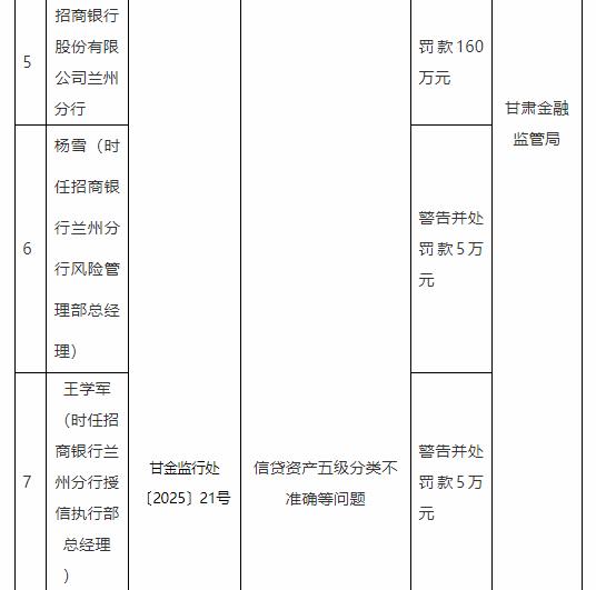 行政处罚信息公示表(甘金监行处〔2025〕21号)显示,招商银行股份有限公司兰州分行、杨雪(时任招商银行兰州分行风险管理部总经理)、王学军(时任招商银行兰州分行授信执行部总经理)、戚莹(时任招商银行兰州分行授信执行部审批中心主任)、王磊(时任招商银行兰州分行营业部个贷客户经理)存在以下主要违法违规行为:信贷资产五级分类不准确等问题。