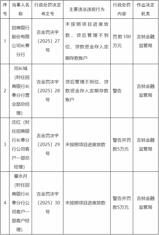 中国经济网北京2月28日讯 国家金融监督管理总局网站昨日公布的行政处罚信息公示表(吉金罚决字〔2025〕27-30号)显示,招商银行股份有限公司长春分行未按照项目进度放款,贷后管理不到位、贷款资金存入定期存款账户。吉林金融监管局对其罚款100万元。