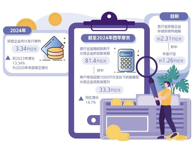 近年来,党中央、国务院高度重视民营企业发展,出台了一系列政策措施。特别是自2024年10月国家金融监督管理总局、国家发展改革委牵头建立支持小微企业融资协调工作机制以来,各大银行精准对接民营企业金融需求,积极引导信贷资源向民营企业倾斜,这一难题正逐步得到缓解。国家金融监督管理总局数据显示,截至2024年四季度末,银行业金融机构用于小微企业的贷款余额81.4万亿元,其中单户授信总额1000万元及以下的普惠型小微企业贷款余额为33.3万亿元,同比增长14.7%。