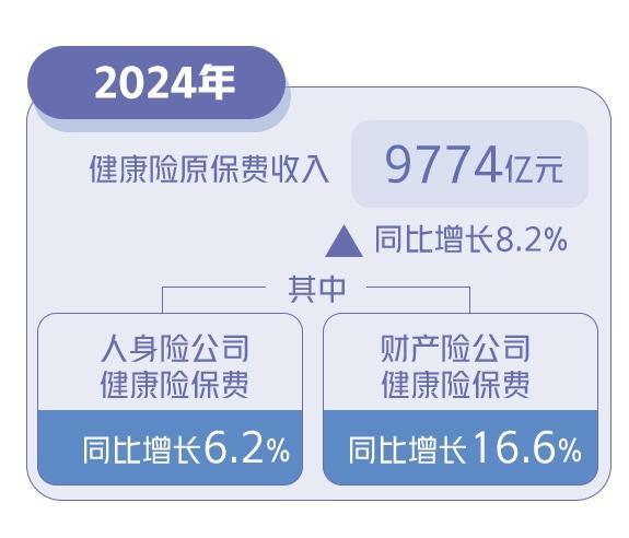 国家金融监督管理总局的数据显示,2024年健康险业务发展速度较快,原保费收入9774亿元,同比增长8.2%。其中,人身险公司健康险保费同比增长6.2%,占人身险公司总保费收入的19.3%。同时,财产险公司健康险保费同比增长16.6%。