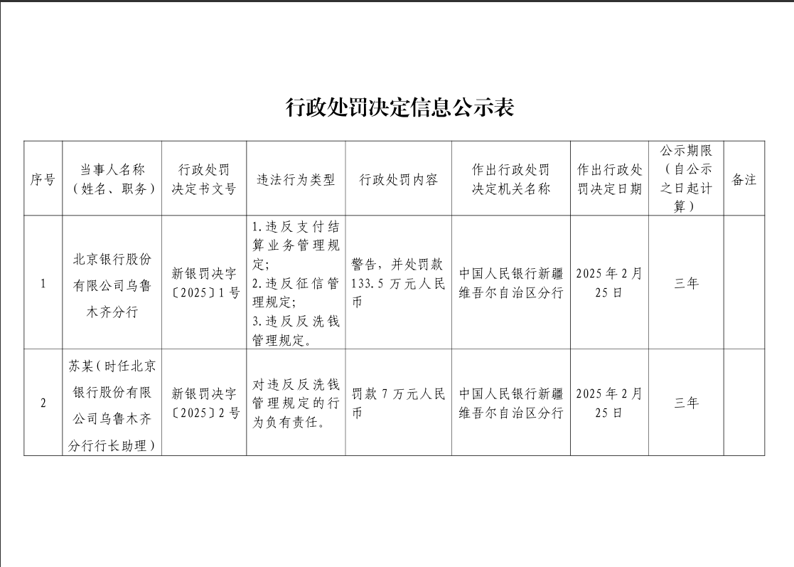 北京银行乌鲁木齐分行被罚133.5万:因违反支付结算业务管理规定等