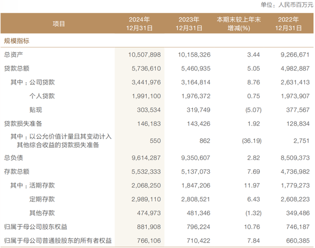 截至2024年末,兴业银行资产总额105078.98亿元,较上年末增长3.44%,其中贷款(不含应计利息)较上年末增加2756.75 亿元,增长 5.05%;各类投资净额较上年末增加1187.50亿元,增长3.56%;公司存放同业及其他金融机构款项(不含应计利息)余额1071.51亿元,较上年末下降42.34%。总负债96142.87亿元,较上年末增长2.82%,其中客户存款(不含应计利息)余额55323.33亿元,较上年末增长7.69%。