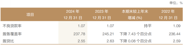 资产质量方面,截至2024年末,兴业银行不良贷款余额614.77亿元,较上年末增加29.86亿元,不良贷款率1.07%,与上年末持平;拨备覆盖率237.78%,较上年末下降7.43个百分点;拨贷比2.55%,较上年末下降0.08个百分点。