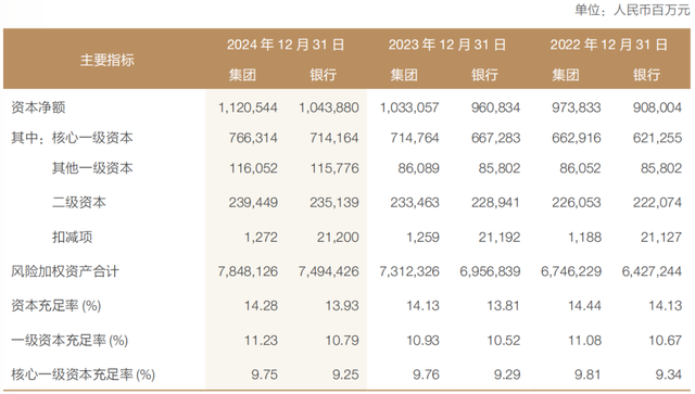 截至2024年末,兴业银行资本充足率、一级资本充足率、核心一级资本充足率分别为14.28%、11.23%、9.75%,较上年末分别上升0.15个百分点、上升0.3个百分点、下降0.01个百分点。