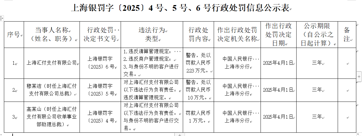 中国经济网北京4月11日讯 中国人民银行上海分行网站4月10日公布了上海银罚字〔2025〕4号、5号、6号行政处罚信息公示表。上海汇付支付有限公司存在违反清算管理规定、违反商户管理规定、与身份不明的客户进行交易的违法行为,被中国人民银行上海市分行警告并处以罚款223万元。