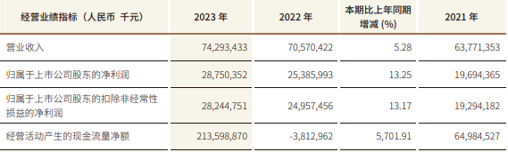 2021年、2022年、2023年,江苏银行的营业收入分别为637.71亿元、705.70亿元、742.93亿元;归属于上市公司股东的净利润196.94亿元、253.86亿元、287.50亿元;归属于上市公司股东的扣除非经常性损益的净利润分别为192.94亿元、249.57亿元、282.45亿元。