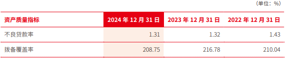 截至2024年末,北京银行不良贷款率为1.31%,较年初下降0.01个百分点;拨备覆盖率为208.75%,较上年末下降8.03个百分点。