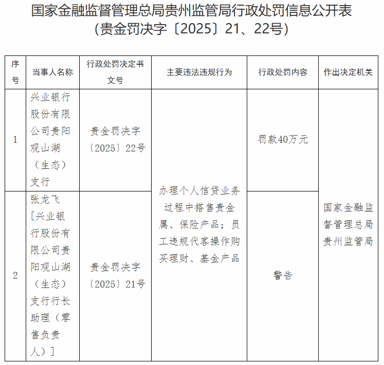 贵金罚决字〔2025〕21、22号显示,兴业银行股份有限公司贵阳观山湖(生态)支行办理个人信贷业务过程中搭售贵金属、保险产品;员工违规代客操作购买理财、基金产品。