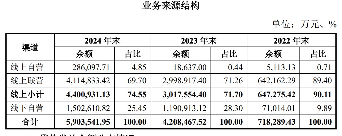 目前,线上业务仍是宁银消金公司业务主要来源。其中线上联营业务,公司主要是通过与蚂蚁、字节、百度、美团、微众等多家互联网头部平台合作,依托消费信贷、信用支付、商品分期等多元场景灵活获客引流,基本实现线上消费场景的全覆盖。截至2024年末,宁银消金线上联营贷款余额达到411.48亿元,占比69.70%。